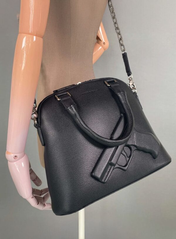 Black leather bag with iconic Gun embossing. Structured, versatile and full of character.